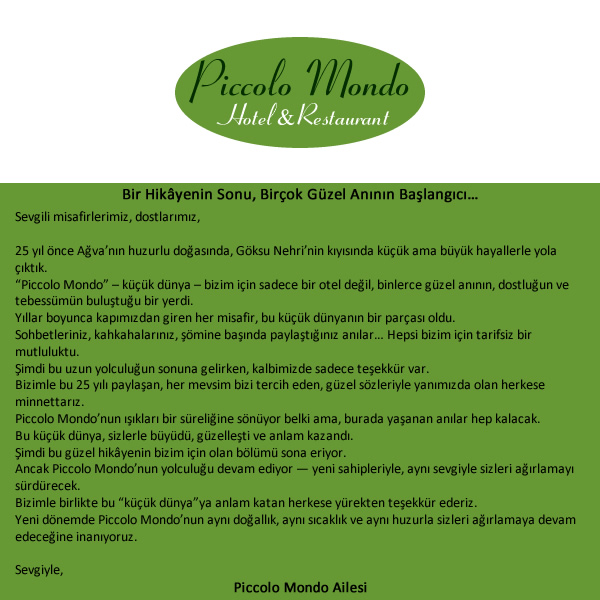 İstanbul’un şirin tatil beldesi Ağva’da yemyeşil bir doğanın içerisinde, Göksu Nehri'nin kıyısında, Karadeniz’in Ağva sahilinden 300 metre uzaklıkta yer alan Piccolo Mondo Otel, toplam 18 odası ile hizmet veren, küçük bir aile işletmesidir.